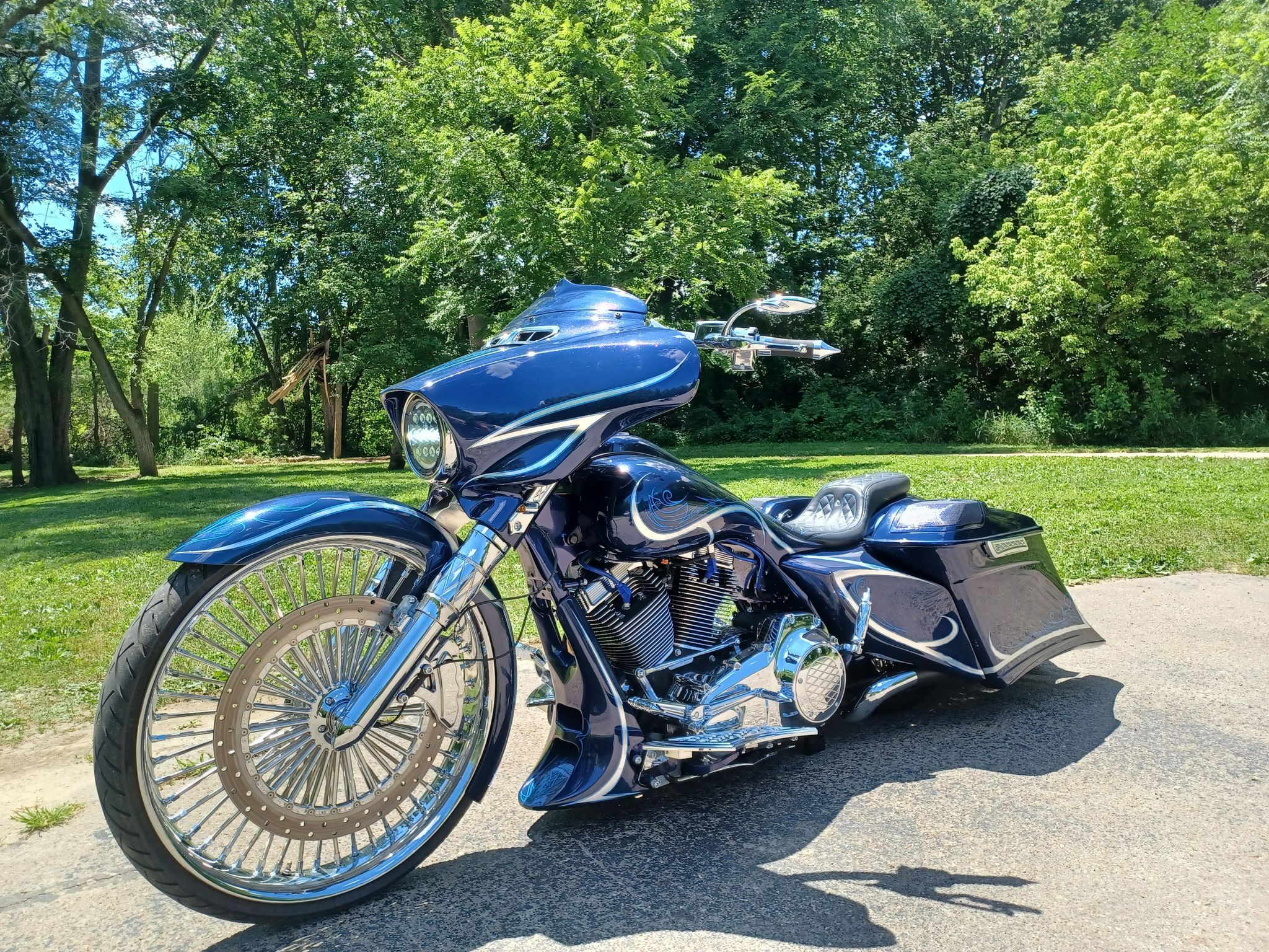 2007 harley touring custom 6 deg rake 21 rc holeshot front wheel with matching rotor 6 piston pm caliper klock werks front wrap fender. Dave Perewitz Custom Motorcycle Paint Show at Cherokee Blue Ridge Run Willie-Palooza at Iron Horse Saloon. Oddly these baggers hid the Softails key feature the lack of external suspension.